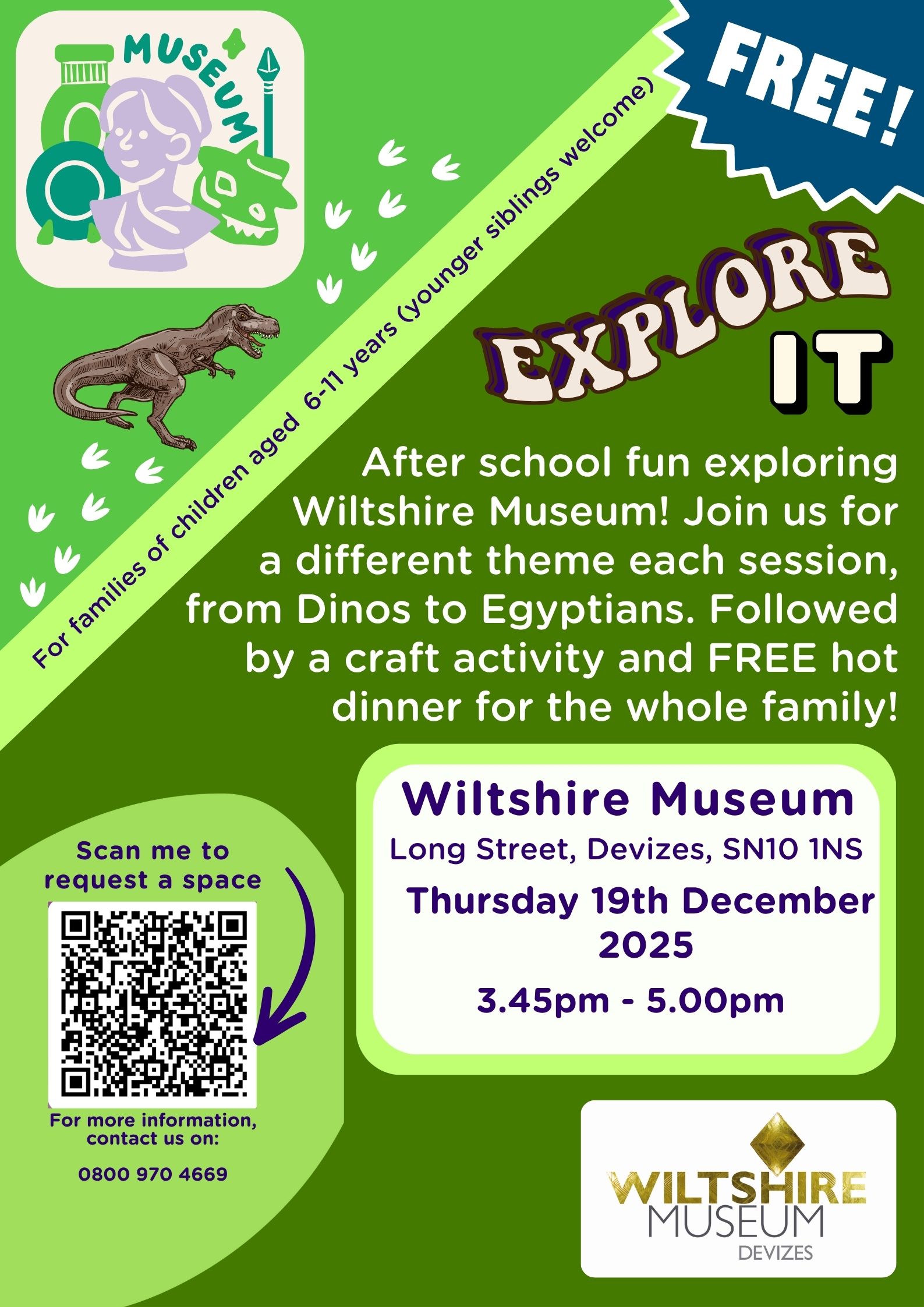 Explore It - family fun and crafts with a free meal | Thursday 18th December 2025 | Let's explore who the Romans were, what dinosaurs ate, when the toilet was invented and much more! | Booking Essential | 5-11 years | Devizes | Poster |