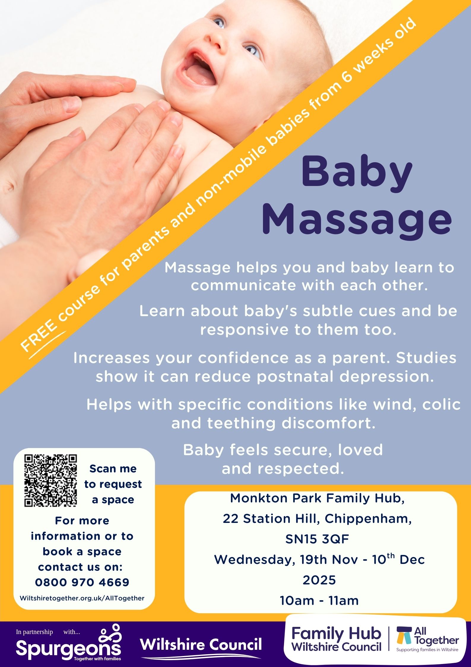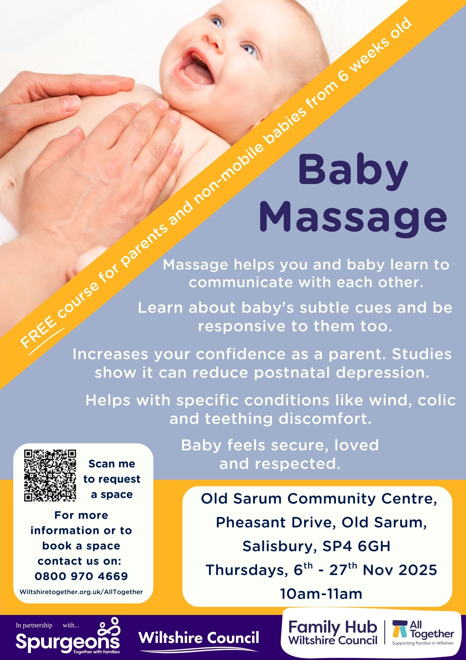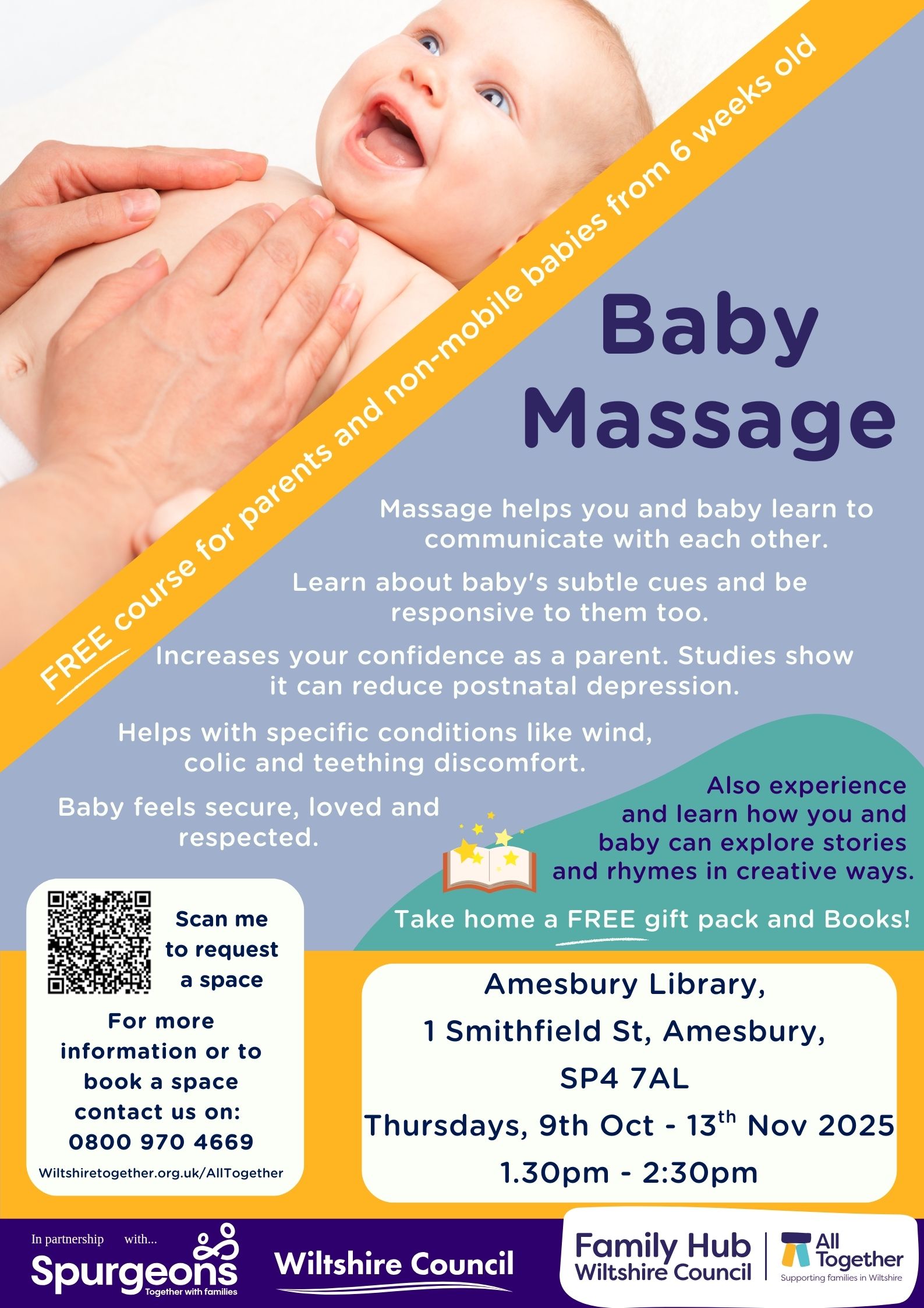 Baby Massage | Thursdays 9th Oct - 13th Nov | Baby Massage | Booking Essential | 0-2 years | Amesbury | Poster |