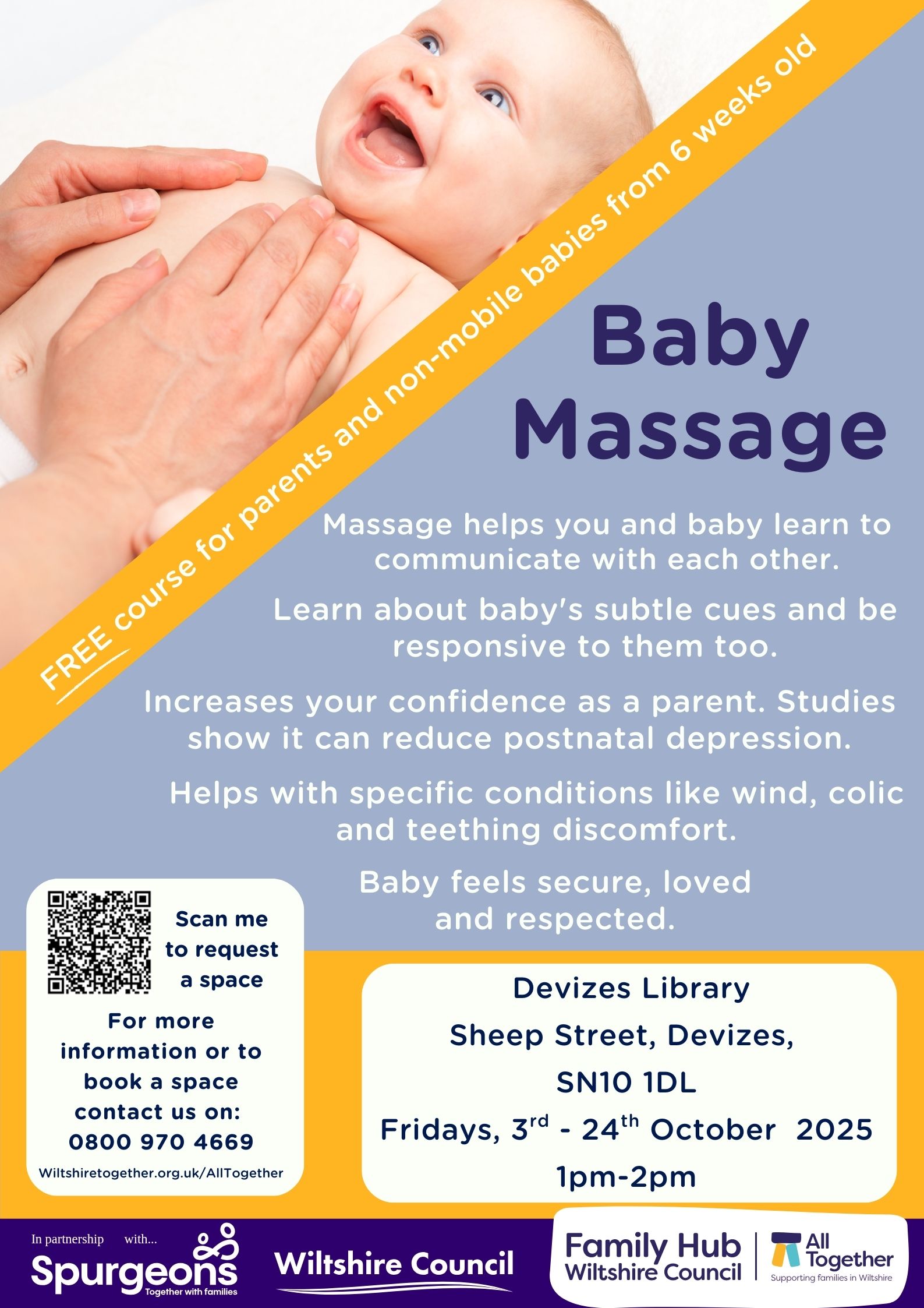 Baby Massage | Fridays 3rd- 24th Oct | Free baby massage course | Booking Essential | 0-2 years | Devizes | Poster |