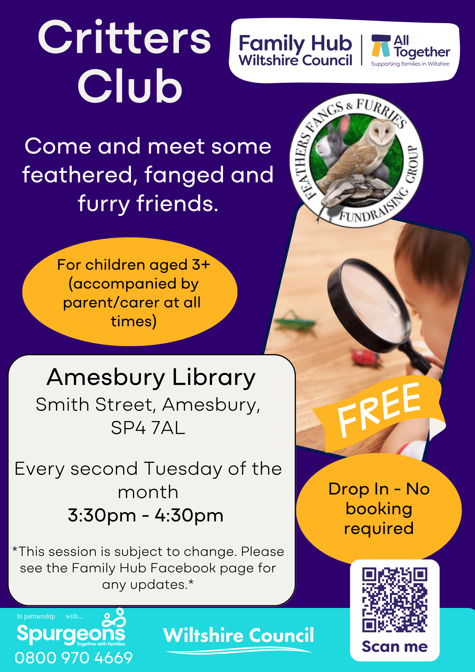 Critters Club | Every second Tuesday of the month | Come and meet some feathered, fanged and furry friends. For children aged 3+ (must be accompanied by a parent/carer at all times). Time: 3.30 0m - 4.30 pm | Drop in - No booking required | 5-11 years | Amesbury | Poster |