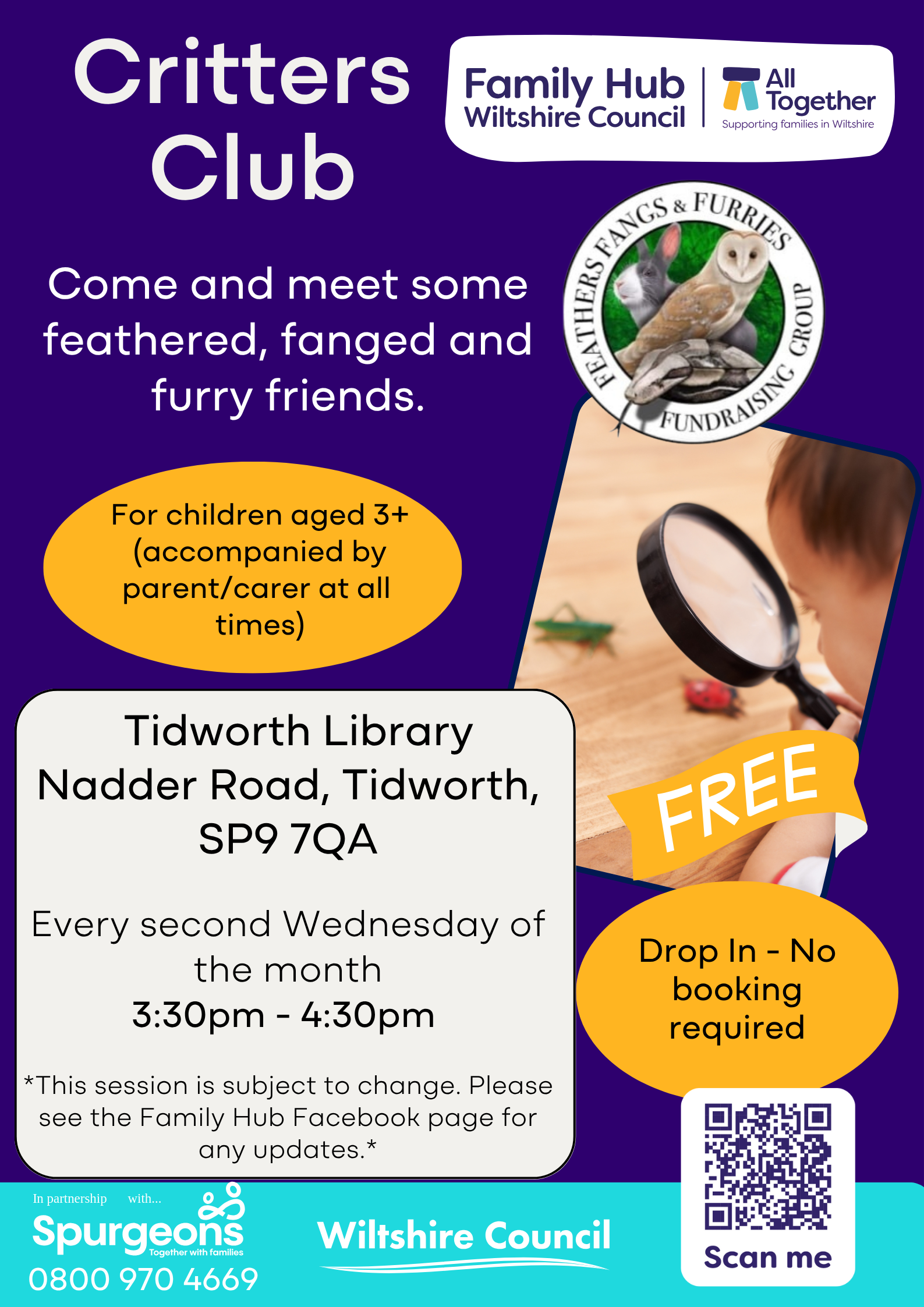 Critters Club | Every second Wednesday of the month | Come and meet feathered, fanged and furry friends! For children aged 3+ (must be accompanied by a parent/carer at all times). Time: 3.30 0m - 4.30 pm | Drop in - No booking required | 5-11 years | Tidworth | Poster |
