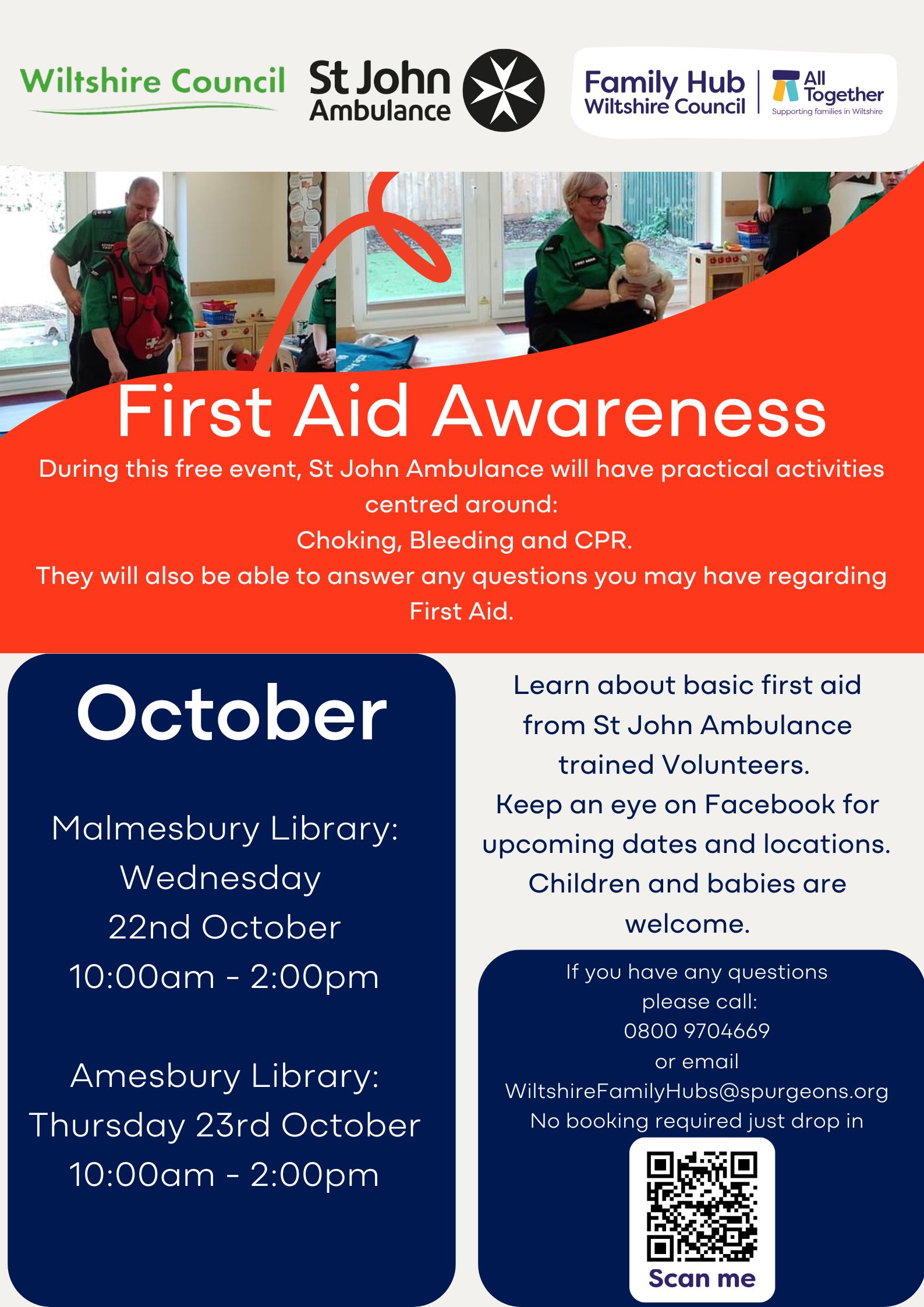 First Aid Awareness | Wednesday 22nd October 2025 | During this free event, St Johns Ambulance will have practical activities centred around choking, bleeding and CPR. They will also be able to answer any questions you may have regarding first aid. All welcome Location: Malmesbury Library, 24 Cross Hayes, Malmesbury SN16 9BG Time: Drop in any time from 10.00 am to 2.00 pm | Drop in - No booking required | All ages | Malmesbury | Poster |