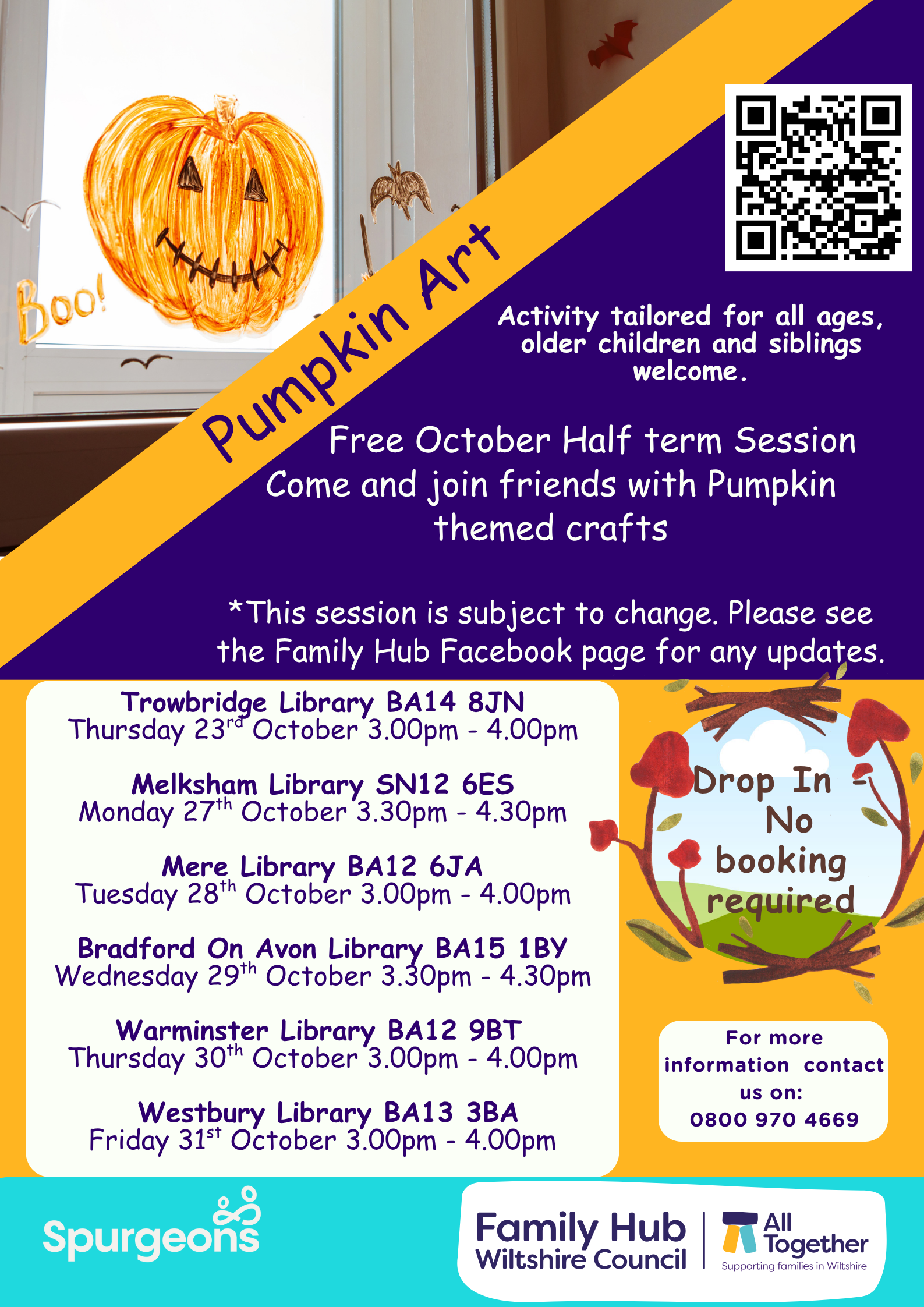Pumpkin Art | Thursday 23rd October 2025 | Enjoy pumpkin themed crafts For families with children any age Location: Trowbridge Library, Time: 3.00 pm to 4.00 pm | Drop in - No booking required | All ages | Trowbridge | Poster |