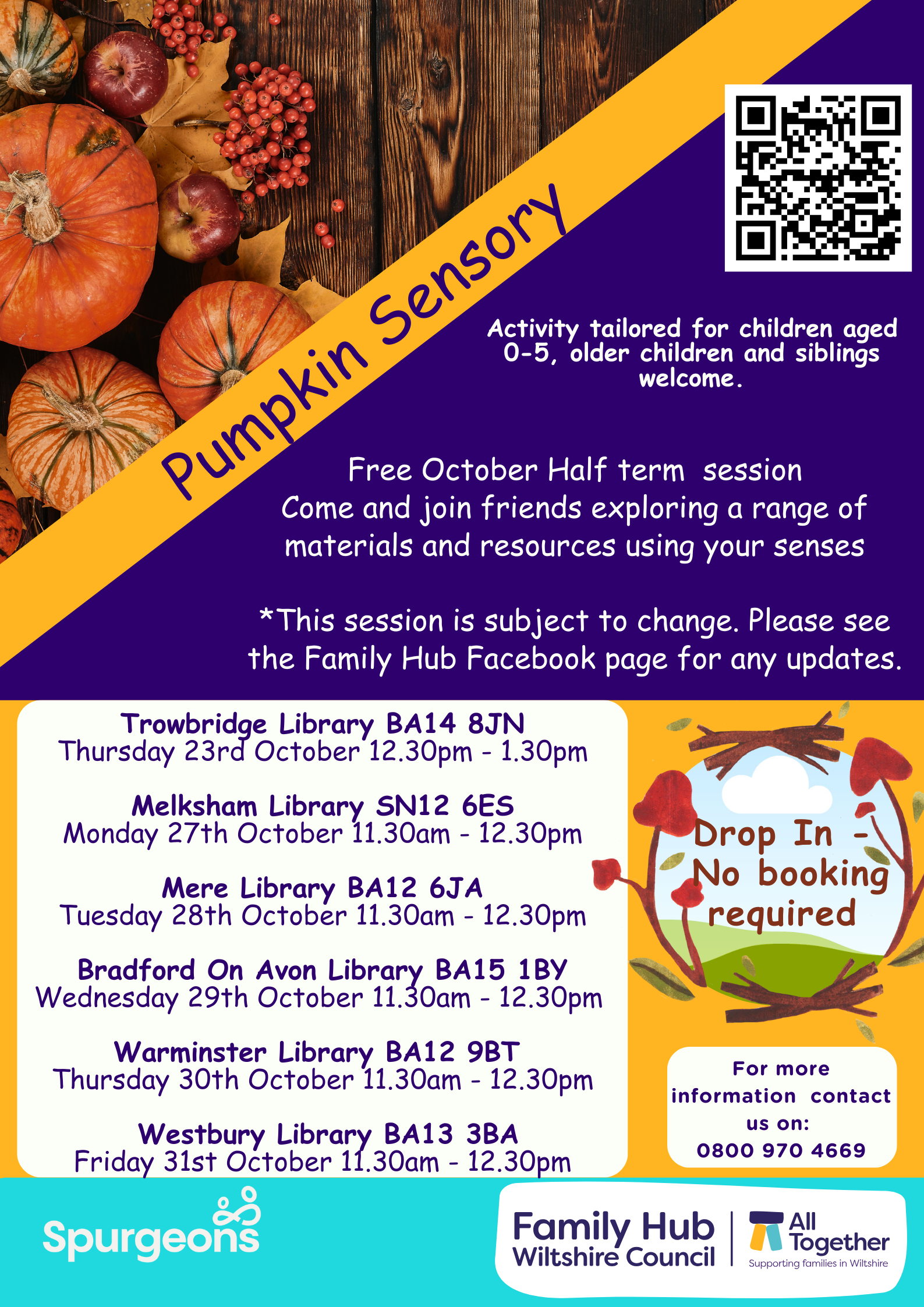 Pumpkin Sensory Fun | Thursday 23rd October 2025 | A sensory experience of autumn materials For families with children aged 0-5 years - older siblings welcome Location: Trowbridge Library, Time: 12.30 am to 1..30 pm | Drop in - No booking required | 0-5 years | Trowbridge | Poster |
