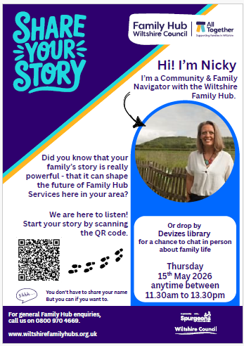 | Share Your Story | Thursday 15th May | 🌼 We want to hear from YOU! Come along to Devizes Library and chat with Nicky, our Community & Family Navigator. Share what life is really like for your family — the highs, the lows, and everything in between. Your lived experiences help us shape better services for our community.